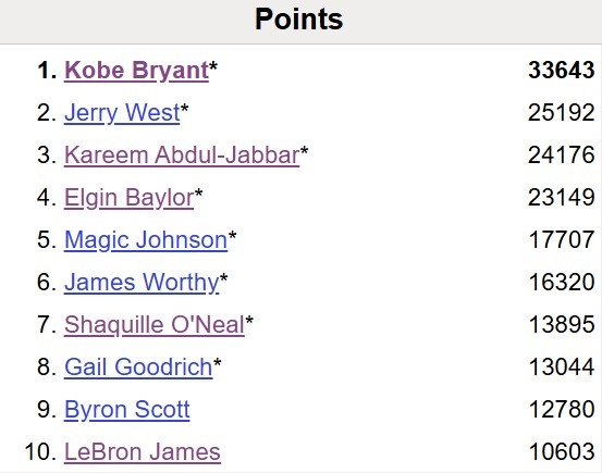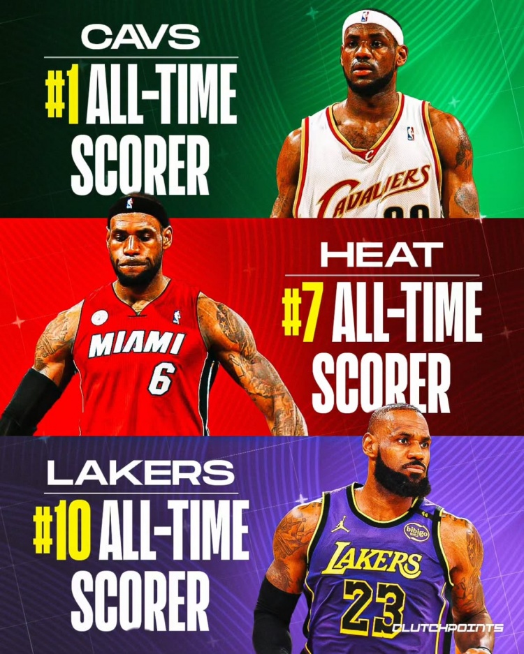詹姆斯在騎士、熱火和湖人三支球隊的生涯總得分都在隊史前十,歷史唯一。