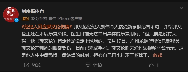經(jīng)紀(jì)人回應(yīng)郭艾倫傷勢(shì):正處康復(fù)階段 醫(yī)生無法給出具體康復(fù)時(shí)間