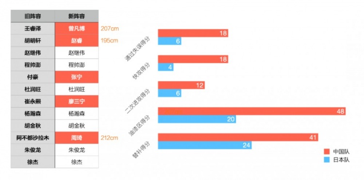 而與上一次亞預(yù)賽輸給日本隊(duì)相比,這次我們迎來了趙睿和周琦的回歸,并且多了2米07的高大鋒線曾凡博。正因?yàn)橛羞@些能在對(duì)位中占據(jù)絕對(duì)體型優(yōu)勢(shì)的球員加入,我們才有了這次42分的大勝。