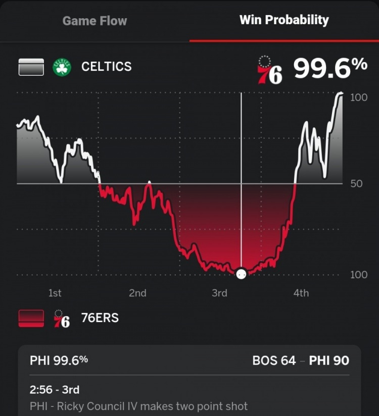 比賽第三節(jié)還剩2分56秒時(shí),76人一度領(lǐng)先26分。ESPN數(shù)據(jù)預(yù)測顯示,76人當(dāng)時(shí)贏球概率高達(dá)99.6%。