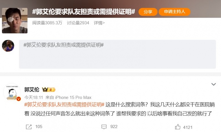在今日微博熱搜中,出現(xiàn)詞條“郭艾倫要求隊友擔(dān)責(zé)或需提供證明”。