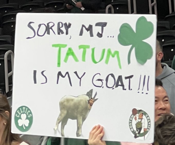 賽前,綠軍主場球迷舉牌,上面貼著塔圖姆頭像的山羊和綠軍隊徽,配文寫道:“對不起了MJ(喬丹),塔圖姆才是我心目中的GOAT(山羊,歷史最佳之意)?!?/p>