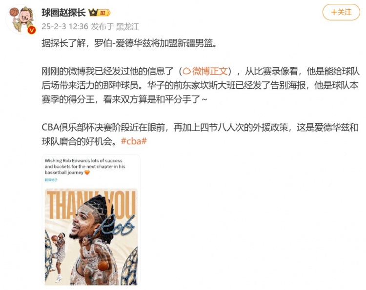 據(jù)趙探長了解,羅伯-愛德華茲將加盟新疆男籃。