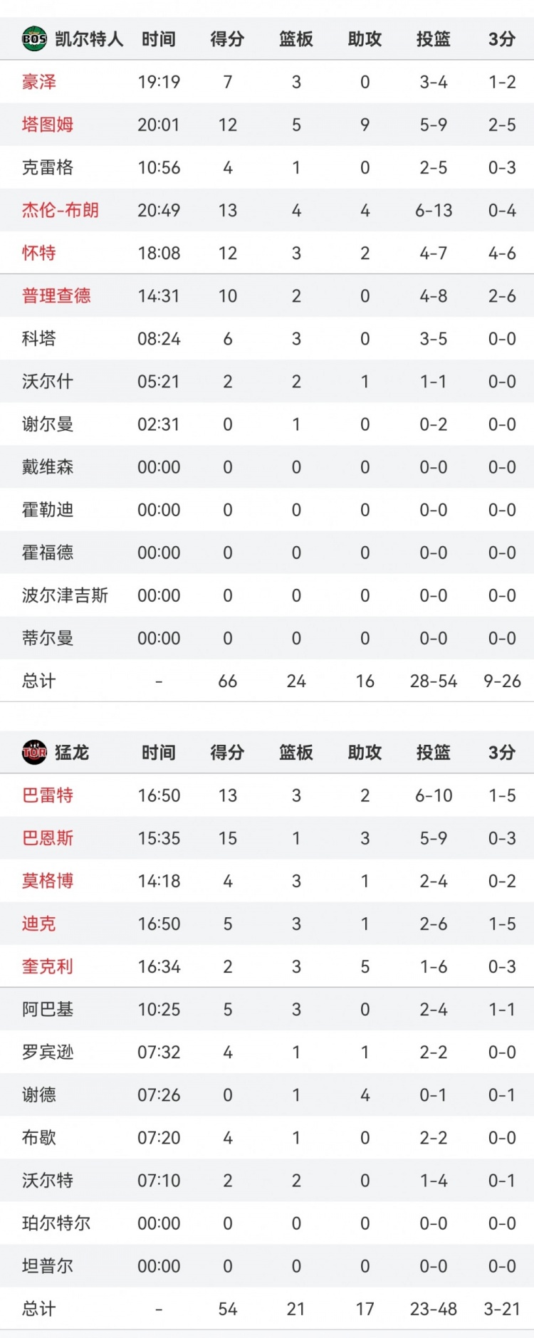 凱爾特人半場66-54領先猛龍12分 全隊4人得分上雙
