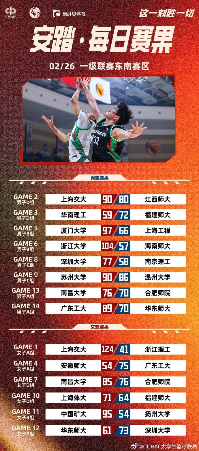 男籃方面,上海交大10分之差險(xiǎn)勝江西師大,福建師大初生牛犢不怕虎10名大一新生拿下首勝,廈門大學(xué)、浙江大學(xué)、深圳大學(xué)均大勝對(duì)手。蘇州大學(xué)南昌大學(xué)以微弱優(yōu)勢(shì)拿下首勝。而在最受關(guān)注的揭幕戰(zhàn)上,廣東工業(yè)大學(xué)在曾煜成的精彩發(fā)揮下戰(zhàn)勝華東師大,取得小組賽首勝!