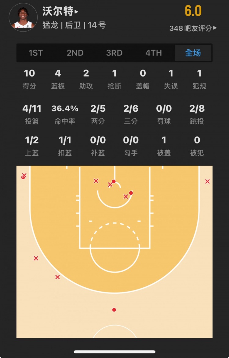 猛龍19號(hào)秀 賈科比-沃爾特 登場(chǎng)21.4分鐘