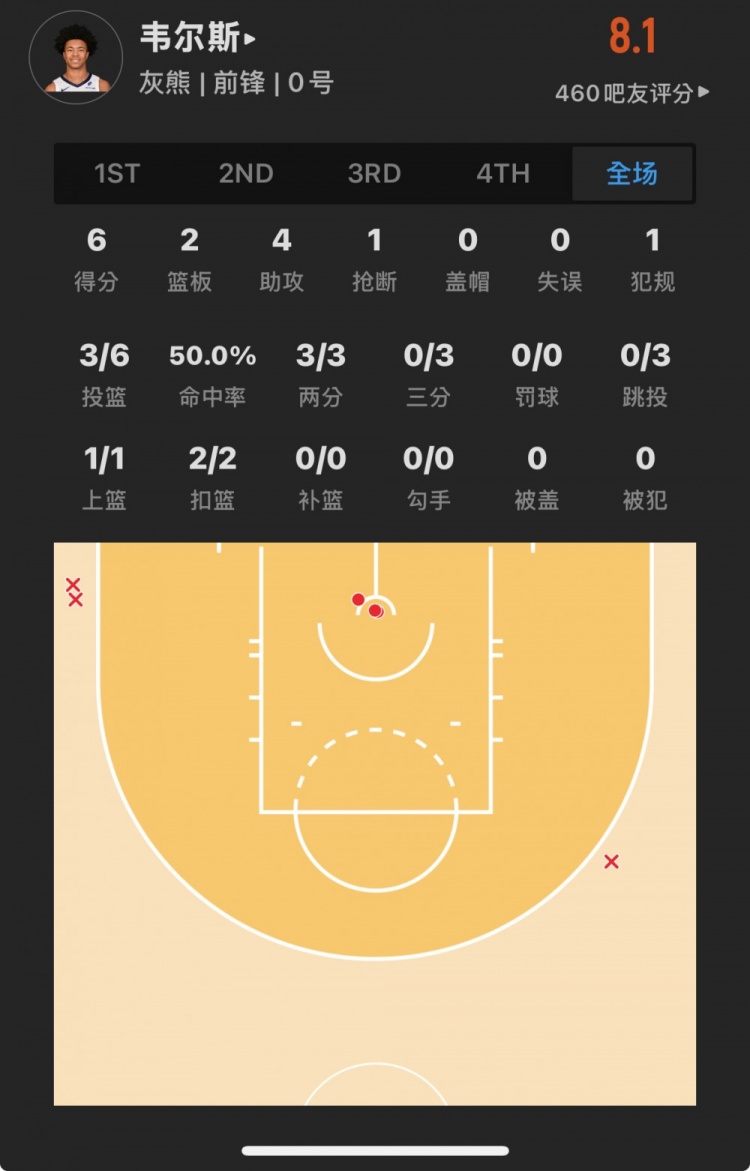 灰熊39號(hào)秀 杰倫-韋爾斯 登場(chǎng)30.9分鐘
