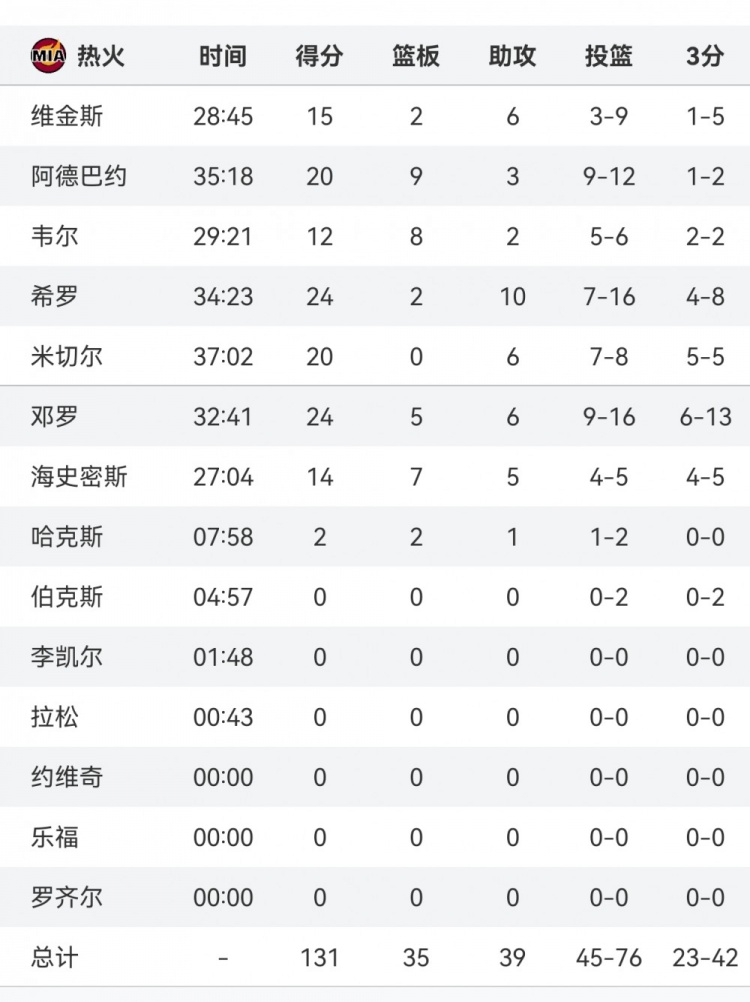 2月27日訊 NBA常規(guī)賽,熱火131-109大勝老鷹。本場比賽,熱火全隊(duì)多點(diǎn)開花、共有7人得分上雙、4人得分20+,具體如下: 標(biāo)簽: 籃球 NBA 熱火 維金斯