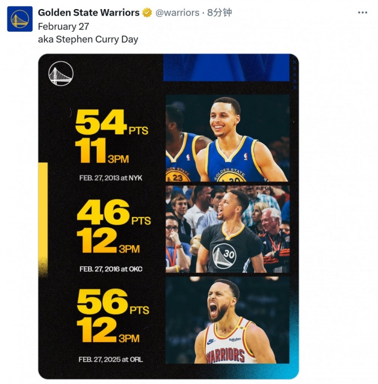 勇士官方曬圖寫道:“2月27日(美國時間),也稱為‘庫里日’?!?/p>