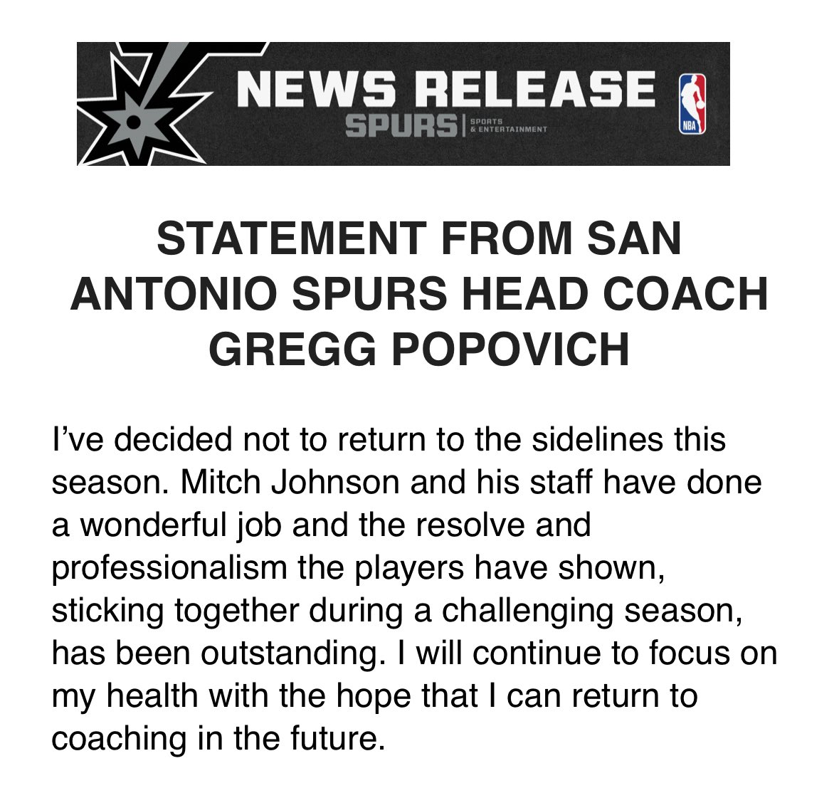波波維奇在聲明中表示:“我決定本賽季不會(huì)再回到場(chǎng)邊,米奇-約翰遜和其團(tuán)隊(duì)的工作做得非常不錯(cuò),球員們也表現(xiàn)出了決心和職業(yè)精神,他們?cè)诔錆M挑戰(zhàn)的賽季中團(tuán)結(jié)一致,非常出色。我會(huì)繼續(xù)關(guān)注我的健康狀況,希望未來能重返教練崗位?!?/p>