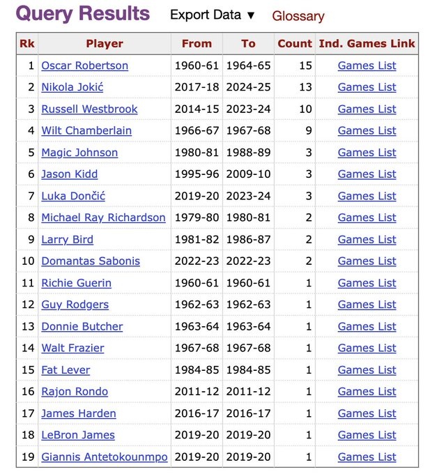 據(jù)統(tǒng)計(jì),這是約基奇生涯第14場(chǎng)比賽至少15分15板15助攻,歷史第2多,距離歷史紀(jì)錄保持者大O僅差1次。