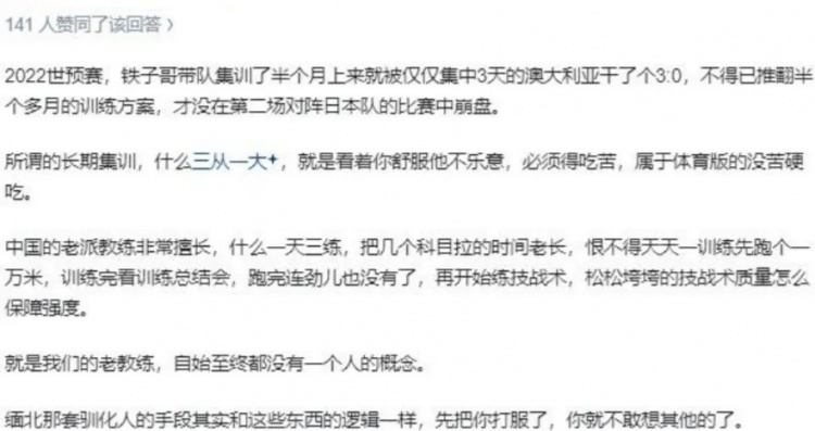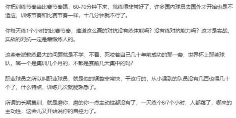 所以,問題不在集訓(xùn)本身,而在于現(xiàn)在大環(huán)境改變下傳統(tǒng)意義上長期集訓(xùn)表現(xiàn)出的不適應(yīng)性。集訓(xùn)本身在這一過程中有什么錯呢?而且宮魯鳴的話“只有長期集訓(xùn)才能提升默契貫徹戰(zhàn)術(shù)?!边@一“只有...才...”的句式起碼是基于過去的實踐經(jīng)驗得出的結(jié)論;而在這一問題下的討論里,我們能看到大量“只要…就…”般的許愿。
