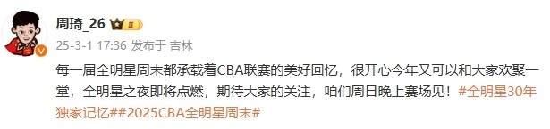 賽前,周琦發(fā)博展望比賽,并寫道:“每一屆全明星周末都承載著CBA聯(lián)賽的美好回憶,很開心今年又可以和大家歡聚一堂,全明星之夜即將點燃,期待大家的關(guān)注,咱們周日晚上賽場見?!?/p>