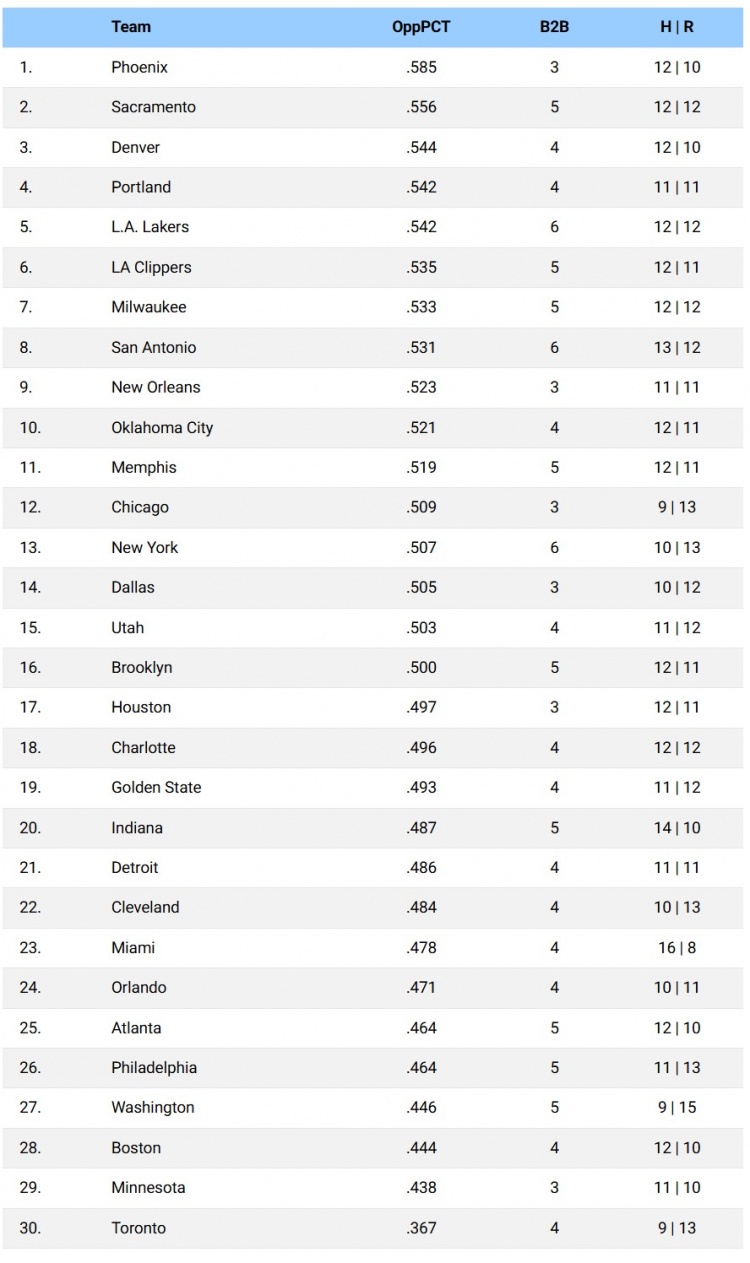 紐約尼克斯:剩余背靠背比賽最多(6場),其中4場(3場為休息劣勢比賽)是背靠背對陣快船(2場)和騎士(2場)。