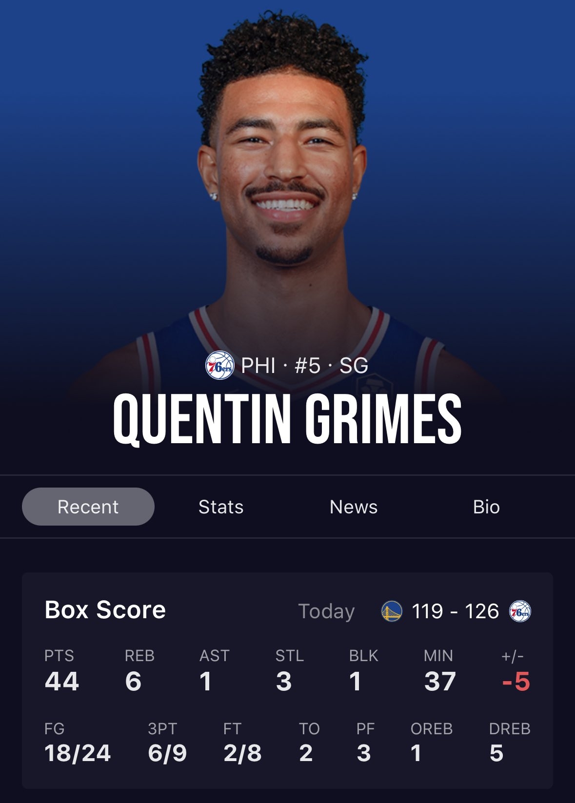 此役,76人后衛(wèi)、獨行俠舊將格萊姆斯表現神勇,他上場36分43秒24投18中,三分9中6、罰球8中2,砍下44分創(chuàng)生涯新高,還有6籃板1助攻3搶斷1封蓋進賬。