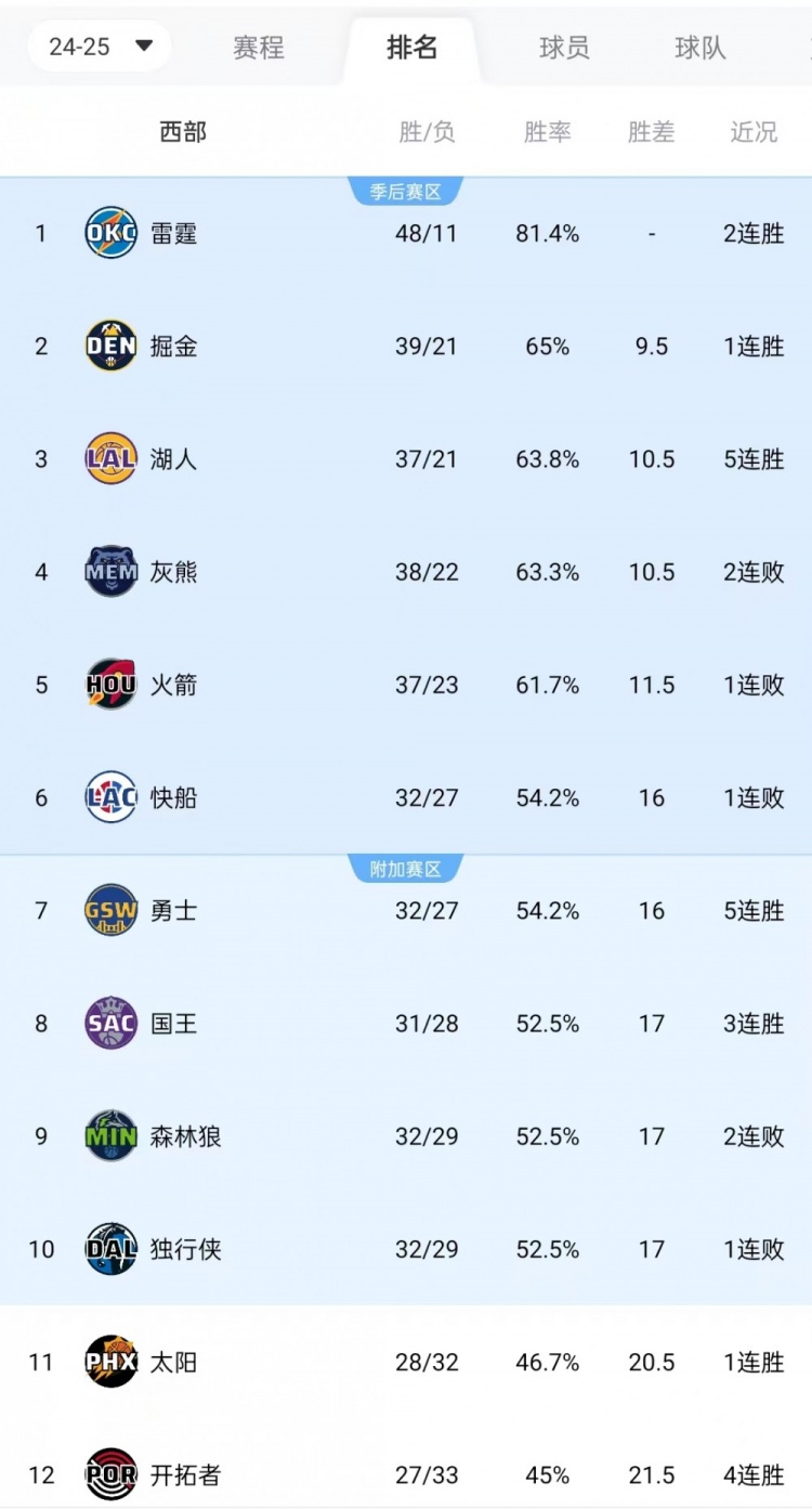 注:獨(dú)行俠與森林狼同戰(zhàn)績(jī),但本賽季獨(dú)行俠對(duì)陣森林狼1勝2負(fù),故排在森林狼之后。