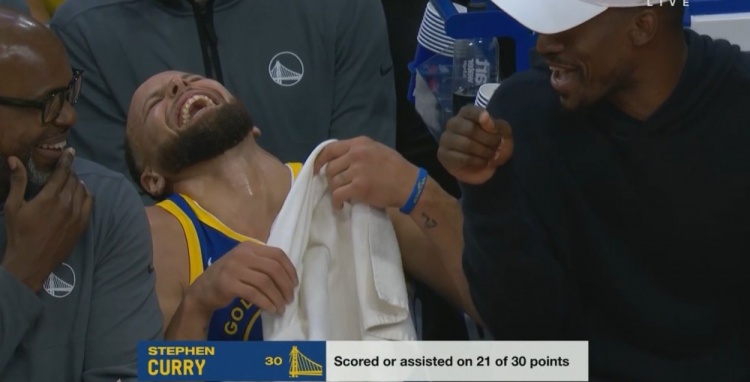 本場巴特勒缺陣,全隊(duì)首節(jié)有21分來自庫里得分或助攻。