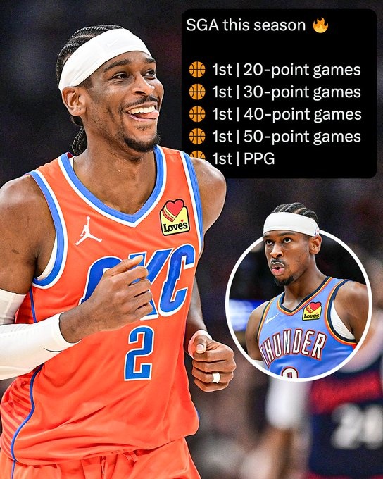 根據(jù)數(shù)據(jù)統(tǒng)計,賽季至今,亞歷山大20+、30+、40+、50+場次以及場均得分(32.6分)都是聯(lián)盟第一。