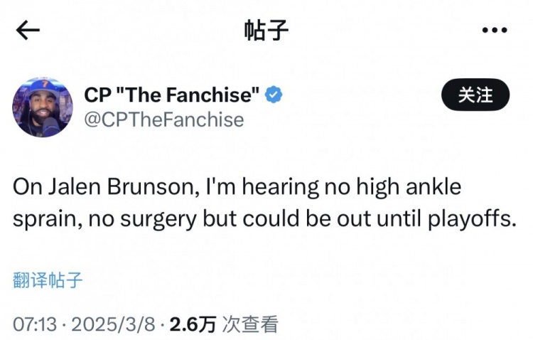 3月8日訊 今日,尼克斯自媒體博主CP“The Franchise”發(fā)推報道了尼克斯后衛(wèi)布倫森的傷情。