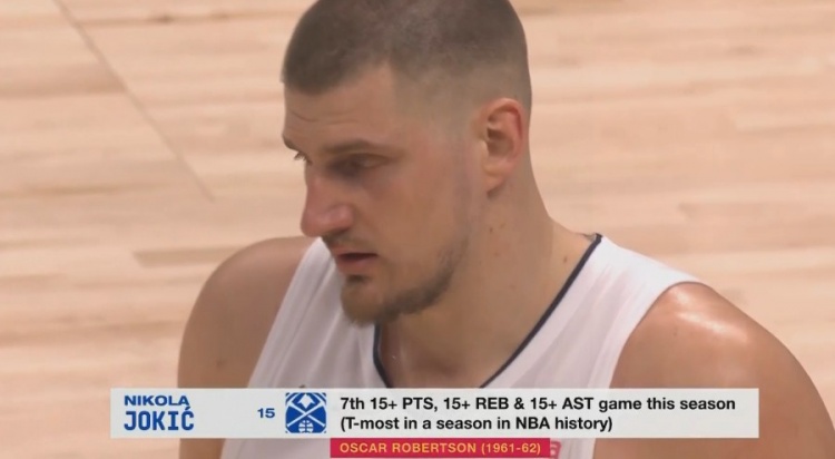 約基奇本季已經(jīng)7次單場至少15分15板15助 追平大O的歷史紀(jì)錄