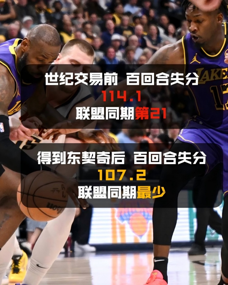 而比起進(jìn)攻端如虎添翼,令人驚訝的是,他們?cè)诜朗囟烁谴虺隽饲八从械馁|(zhì)量。在一個(gè)被質(zhì)疑“防守有巨大問題”的東契奇加入之后,湖人隊(duì)反而成為百回合失分同期最少的球隊(duì)。他們每百回合足足少丟了6.9分,成為交易日后聯(lián)盟獨(dú)一檔的防守鐵軍。