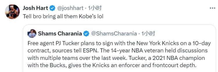 尼克斯球員哈特調(diào)侃道:“告訴兄弟,把他的所有科比鞋都帶來(lái)。”