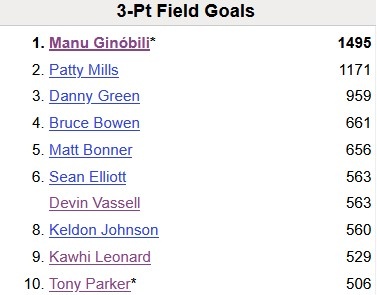 至此,瓦塞爾生涯三分命中數來到564個,超越埃利奧特,獨占馬刺隊史第6位!