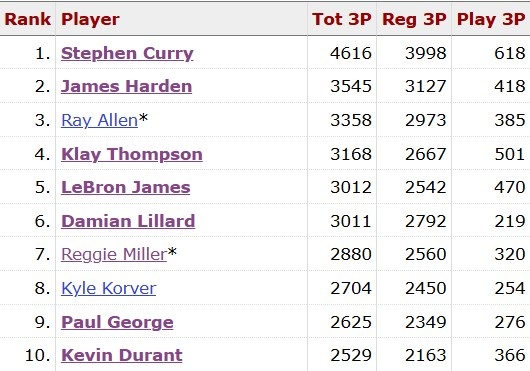 庫(kù)里常規(guī)賽和季后賽三分命中數(shù)來到4618記 距5000大關(guān)僅差382記
