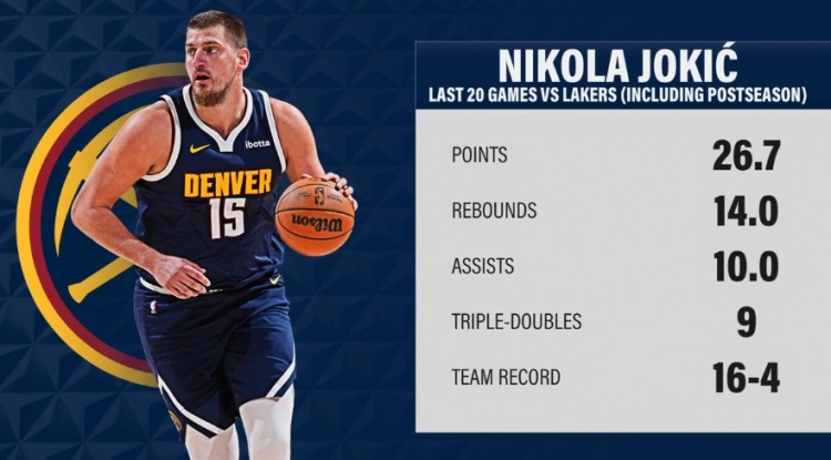約基奇過去20場(chǎng)對(duì)陣湖人:場(chǎng)均26.7分14板10助&9次三雙 16勝4負(fù)