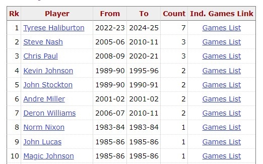 根據(jù)數(shù)據(jù)統(tǒng)計,這是哈利伯頓生涯第8次打出單場至少20分15助并且0失誤的比賽,他在這一榜單上高居歷史第1。