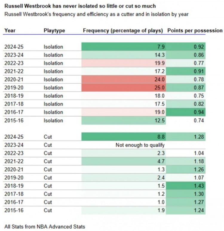(圖為威少近十年空切、單打的頻率和每回合得分:上半部為單打,下半部為空切,第三列為頻率,第四列為每回合得分)