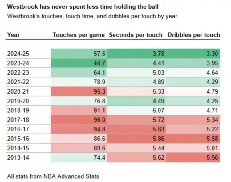 (圖為威少十多年來的持球情況:第一列為賽季,第二列為場(chǎng)均觸球次數(shù),第三列為每次觸球時(shí)間,第四列為每次觸球運(yùn)球次數(shù))