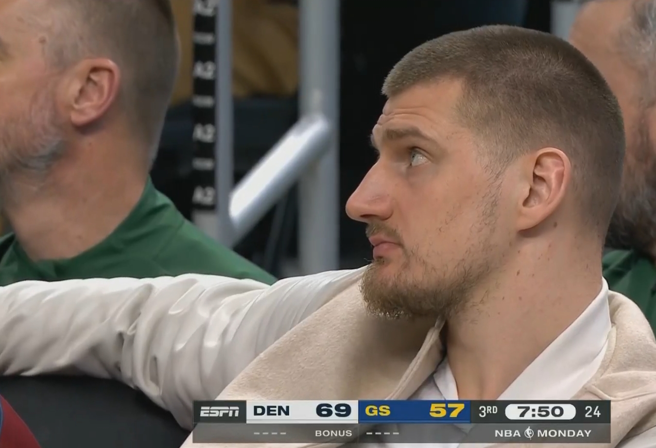 舒服~殘陣掘金領(lǐng)先勇士兩位數(shù) 場下的約基奇一臉淡定~
