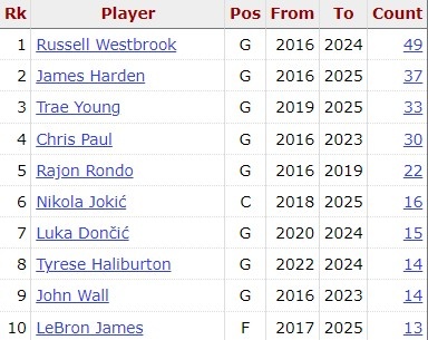 據(jù)統(tǒng)計(jì),這是威少過去10個(gè)賽季以來,第50次半場(chǎng)助攻上雙,為同期最多,哈登以37次排第二。