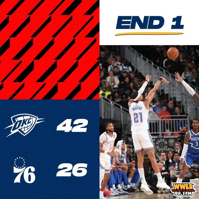 本場比賽,雷霆全隊(duì)輪休主力但仍火力十足。首節(jié)轟下42分創(chuàng)下了球隊(duì)賽季首節(jié)新高!