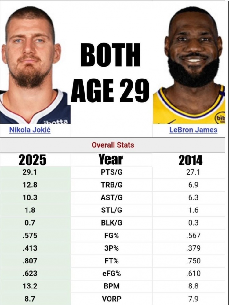 29歲約基奇場(chǎng)均29.1分12.8板10.3助1.8斷 各項(xiàng)數(shù)據(jù)皆>同期詹姆斯