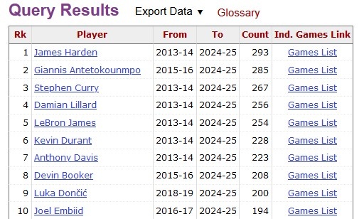 據(jù)統(tǒng)計,哈登是2014年以來,聯(lián)盟中砍下30+場次數(shù)最多的球員,算上今天已有294場。字母哥、庫里分列2、3位。