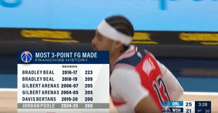 首節(jié)比賽,普爾命中2記三分,本賽季他已經(jīng)投進了200記三分,距比爾保持的奇才隊史最高紀錄還差23記。