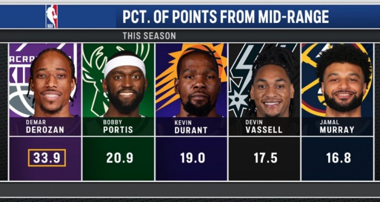 經(jīng)典永不過時(shí)!本賽季中距離得分占比德羅贊33.9%第一&杜蘭特第三