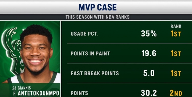 比賽開始前,電視轉播商列舉了字母哥競爭本賽季MVP的優(yōu)勢,賽季至今,字母哥的使用率35%,聯(lián)盟第1,場均禁區(qū)得分19.6分,聯(lián)盟第1,場均快攻得分5分,聯(lián)盟第1,場均30.2分,聯(lián)盟第2。
