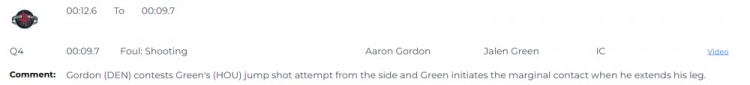 比賽最后9.7秒,戈登(掘金)從側(cè)面干擾杰倫-格林(火箭)的投籃出手,格林在伸腿時主動制造了輕微接觸。
