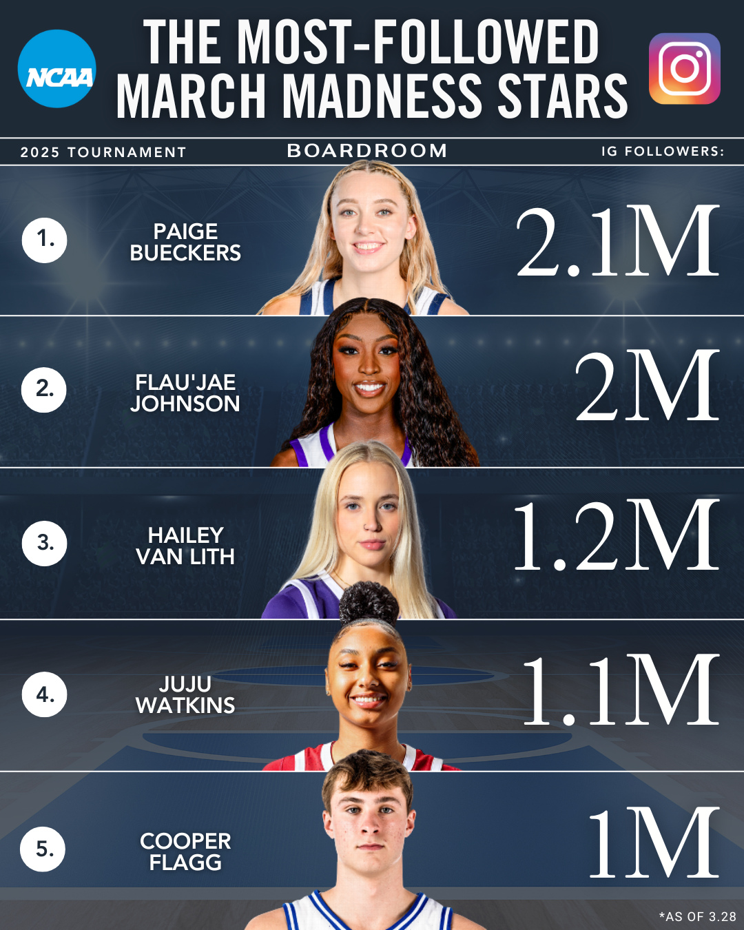 03月30日訊 美媒Boardroom今日統(tǒng)計(jì)了本屆NCAA瘋?cè)騿T的Instagram粉絲排名,NBA狀元大熱弗拉格以100萬(wàn)粉絲排名第5,粉絲數(shù)“僅為”WNBA狀元大熱佩奇-布克斯的一半不到。