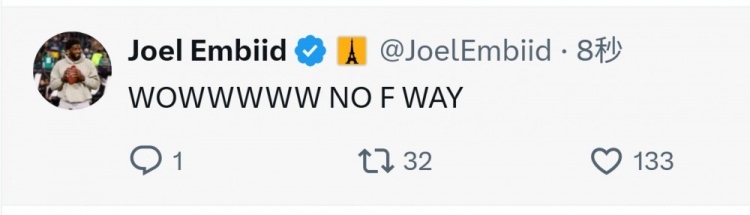 恩比德發(fā)推寫(xiě)道:“哇哦.... 臥槽不會(huì)吧。”