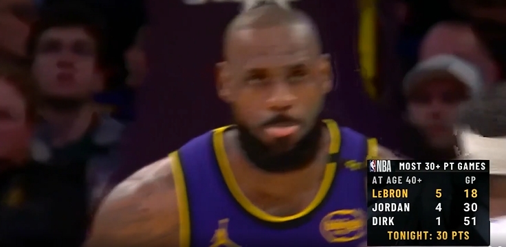 湖人VS勇士詹姆斯前三節(jié)已經(jīng)砍下30+。40歲之后詹姆斯已經(jīng)砍下5次30+排名歷史第一,是其他人之和(喬丹4次+諾維茨基1次),值得一提的是,詹姆斯40歲之后還只打了18場比賽。 標簽: 籃球 NBA 湖人 詹姆斯