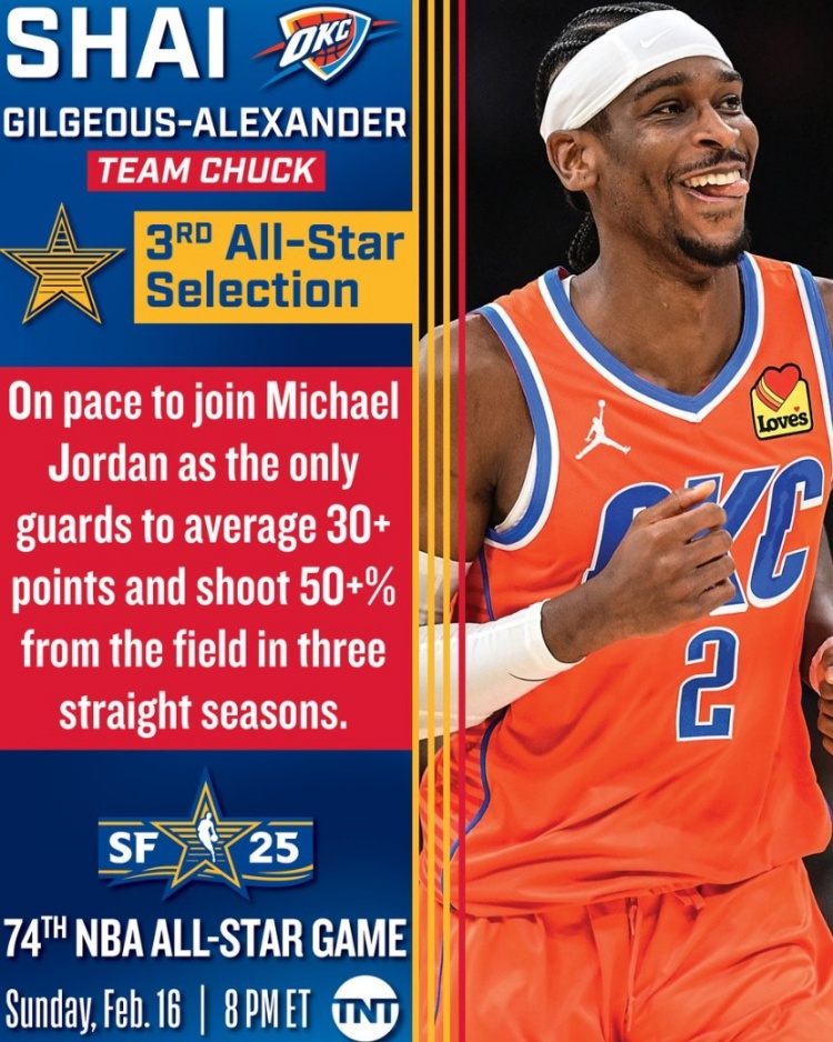 據(jù)統(tǒng)計(jì),亞歷山大有望成為NBA歷史上第二位連續(xù)三個(gè)賽季場均得分30+、且命中率50%+的后衛(wèi),第一個(gè)是喬丹。