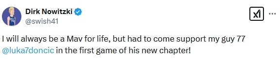 獨(dú)行俠名宿諾維茨基現(xiàn)場(chǎng)觀戰(zhàn),他發(fā)推寫(xiě)道:“我永遠(yuǎn)都是獨(dú)行俠的一員,但我今天得來(lái)支持我的兄弟東契奇,看他開(kāi)啟生涯新篇章的第一場(chǎng)比賽!”