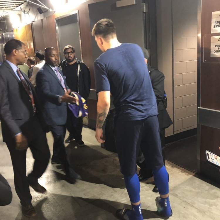 湖記Dave McMenamin更推曬照:“這些模糊的照片拍攝于2018年11月1日,菜鳥賽季的東契奇首次打完湖人后索要詹姆斯球衣,隨后東契奇前往湖人更衣室從保安手中拿到了球衣?!?/p>