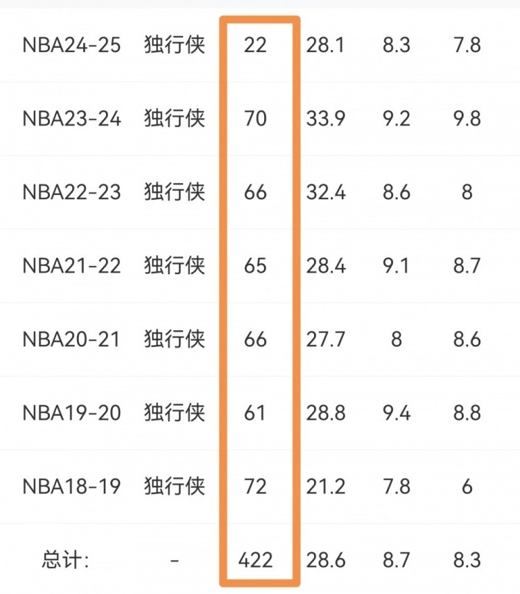 東契奇生涯出勤率并不低。除去本賽季外,東契奇生涯單賽季最多只缺席17場比賽。每個賽季平均出戰(zhàn)67場,具體如下: