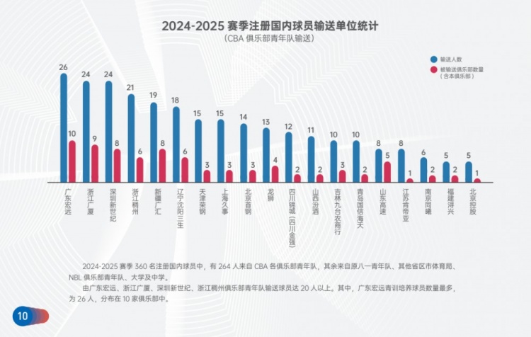2024-2025賽季 360 名注冊國內(nèi)球員中,有264人來自CBA各俱樂部青年隊,其余來自原八一青年隊、其他省區(qū)市體育局、NBL俱樂部青年隊、大學及中學。
