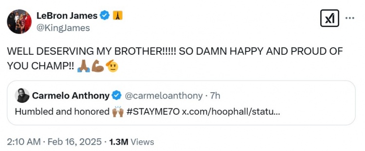 勒布朗-詹姆斯轉(zhuǎn)發(fā)評論道:“我的兄弟實至名歸!?。。。∥襎MD太為你這位冠軍感到高興和驕傲了??????????????????????!”